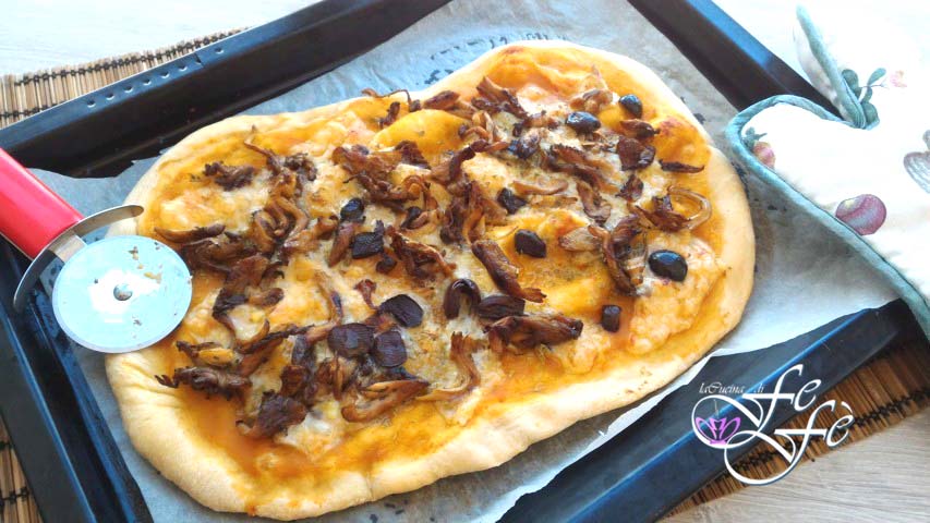 Und voilà… Ihre Pizza mit gelber Tomatensoße, Pleurotus-Pilzen und Oliven ist bereit zum Genießen!Guten Appetit aus Fefès Küche!