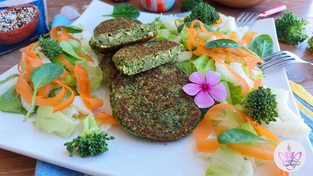 Vor ein paar Wochen, während ich einkaufen war, muss ich zugeben, dass ich in Versuchung geraten bin, auch fertige pflanzliche Burger zu kaufen, die man nur wenige Minuten in der Pfanne oder Heißluftfritteuse erhitzen muss, um sie auf den Tisch zu bringen! Ab und zu gibt es Tage, an denen es schwer ist, sich in der Küche zu organisieren, und es ist praktisch, etwas Schnelles auf dem Teller zu haben! Natürlich bin ich dem Reiz des fertigen Produkts erlegen, weil die Zutatenliste absolut gut war, aber der Geschmack hat mich nicht vollständig zufrieden gestellt! Quinoa, Spinat und Grünkohl waren die Hauptzutaten, schienen jedoch etwas fade! Ich habe also beschlossen, dass ich sie zu Hause mit besseren Ergebnissen nachmachen könnte, indem ich den Grünkohl durch Brokkoli-Röschen ersetze oder, wenn du möchtest, anderes Gemüse, das im Kühlschrank übrig bleibt! Nun, was soll ich sagen? Der Geschmack von „hausgemacht“ ist unvergleichlich, und sie sind auch gegen Lebensmittelverschwendung! Übrigens werden sie ziemlich schnell zubereitet, da man die Brokkoli in einem Topf mit einer Lauchzwiebel und einer halben Zwiebel nur wenige Minuten anbrät und alles in eine Küchenmaschine gibt! Die Mengen, die ich dir gebe, sind perfekt für eine Familie von 6 Personen, ansonsten kannst du sie nach dem Kochen einfrieren und bei Bedarf auftauen! Übrigens ist Quinoa ein Pseudogetreide glutenfrei, man muss also nur das normale Paniermehl im Rezept durch glutenfreies ersetzen, um es auch für Zöliakie geeignet zu machen! Ansonsten handelt es sich um pflanzliche Burger, die für die ganze Familie und auch für diejenigen geeignet sind, die eine vegane Ernährung verfolgen. Reich an Vitaminen, Mineralstoffen und entzündungshemmenden sowie antioxidativen Eigenschaften durch den Spinat und die Brokkoli, sind sie perfekt und praktisch vorzubereiten und auch ins Büro mitzunehmen, bei einem Tagesausflug oder als Abendessen-Retter!