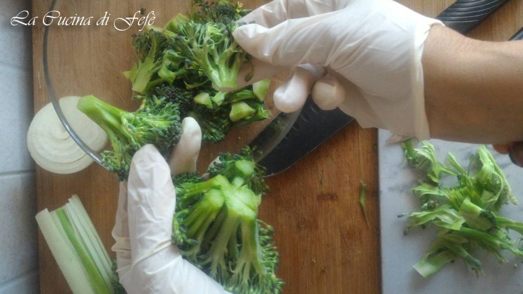 Dann füge die Brokkoliröschen hinzu und gieße nach und nach heißes Wasser dazu, nur wenn nötig, und lasse sie 8-10 Minuten dünsten.