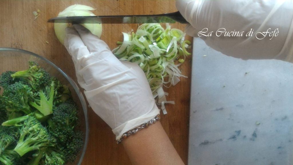 Schneide den Lauch in Streifen und hacke die halbe Zwiebel fein.