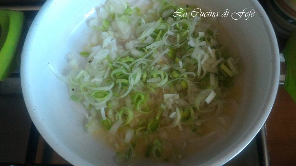 In einem großen Topf erhitze zwei Esslöffel Öl und lasse den gehackten Lauch und die Zwiebel ein paar Minuten bei schwacher Hitze anbraten.