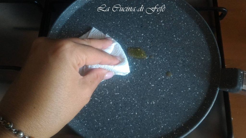 Erhitze die Pfanne und fette sie mit einem Schuss Öl ein und entferne den Überschuss mit einem Küchentuch.