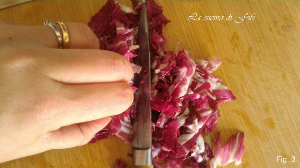 Wasche und tupfe die Radicchio-Blätter mit Krepppapier ab. Entferne den weißen, bittereren Mittelstiel von allen Blättern und schneide den restlichen Teil in feine Streifen.