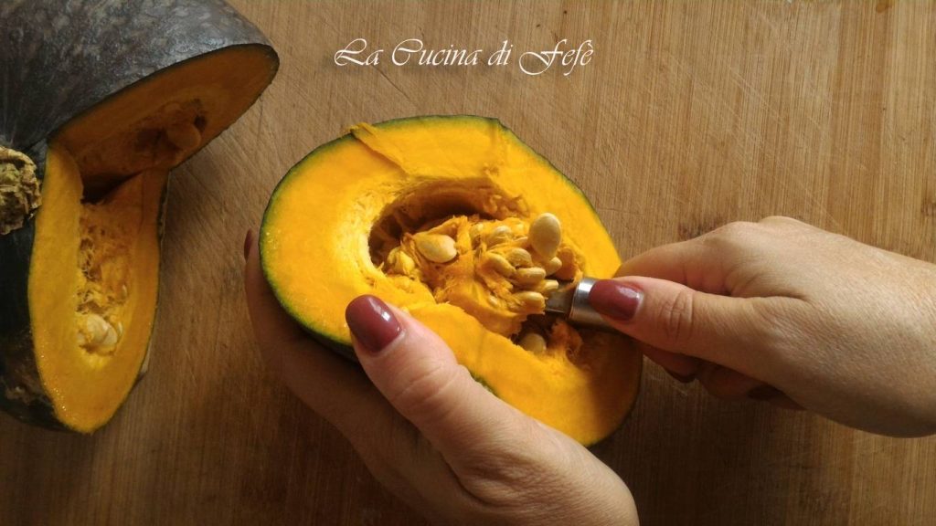 • In der Zwischenzeit, reinige den Kürbis, indem du die Samen und die inneren Fasern mit Hilfe eines Kugelausstechers entfernst.