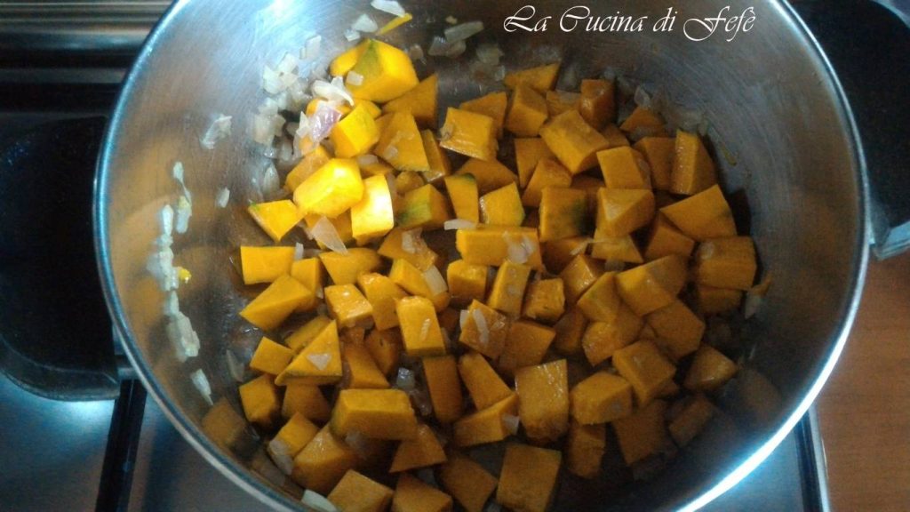 • Füge die Kürbiswürfel hinzu und lasse sie weitere 2′ unter ständigem Rühren mit einem Holzlöffel anbraten.