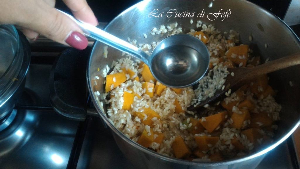 • Gib eine Kelle heiße Gemüsebrühe dazu und rühre oft um. Füge jeweils eine Kelle Brühe hinzu, sobald die vorherige vollständig aufgenommen wurde, und koche den Reis so etwa 18′ oder gemäß den auf deiner Packung angegebenen Zeiten.