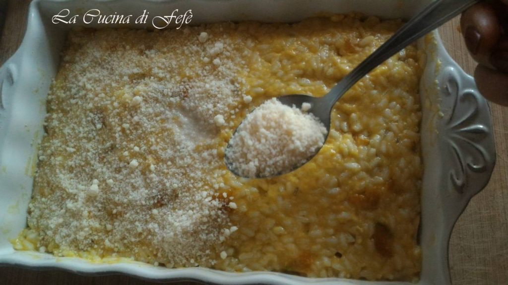 • Schließe den Reiskuchen mit dem Rest des Reis und bestreue die Oberfläche mit der anderen Hälfte des geriebenen Parmesans.