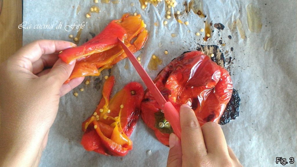 • Nach dieser Zeit lassen Sie sie abkühlen, schälen Sie sie und entfernen Sie die inneren Samen. Schneiden Sie sie dann in Streifen (Abb. 3).