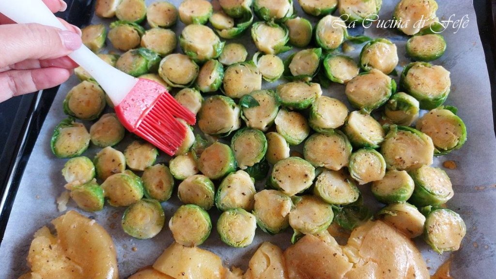 Die Oberfläche der Rosenkohl großzügig mit dieser Emulsion bestreichen, dabei etwas davon übrig lassen. Im Ofen bei 200°C für 25 Minuten backen, dann den Grill einschalten und die Garzeit um weitere 5 Minuten verlängern.