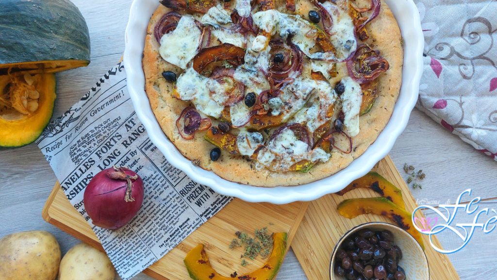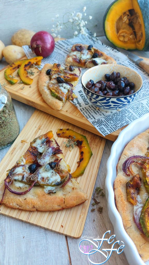 Viele von euch wissen, dass es auf meinem Blog eine Rubrik für glutenfreie Rezepte gibt, da ich gelegentlich Anfragen zu Ideen ohne glutenhaltige Zutaten erhalte! Außerdem ist eine meiner besten Freundinnen Zöliakie-Betroffene, daher war es absolut notwendig, diese Bedürfnisse zu erfüllen, wenn nicht sogar prioritär! Ich habe festgestellt, dass es wirklich schwierig ist, für jemanden wie mich, der sich ab und zu der glutenfreien Küche widmet, die richtige Konsistenz zu finden, denn glutenfrei zu kochen bedeutet nicht, den Geschmack der Speisen, die wir zubereiten, zu verändern, sondern den Bindungsprozess zu beeinflussen! Das Gluten hält das Essen zusammen und verleiht ihm eine „elastische“ Qualität, insbesondere wenn wir über Teige sprechen. Kurz gesagt, ohne Gluten würden die Teige leicht reißen. Hier, mit diesem heutigen Rezept, das ihr im Korb der Rubrik Il Granaio Ende Oktober finden werdet, glaube ich, den richtigen Kompromiss für ein wirklich zufriedenstellendes Ergebnis gefunden zu haben! Eine knusprige Focaccia an der Oberfläche, aber auch aufgrund der Zugabe von Kartoffeln im Inneren weich in der Konsistenz! Eine Mischung aus glutenfreiem Mehl, direkt aus den Vorräten einer berühmten Marke, die meine Freundin geschenkt hat und die notwendig ist zu verbrauchen, die ihr aber durch Reismehl ersetzen könnt. Dazu kommen dann in kleineren Mengen Buchweizenmehl und Maisstärke, beide bekanntlich glutenfrei. Was das Topping betrifft, könnt ihr eurer Fantasie freien Lauf lassen! Ich empfehle euch, meine Version mit gegrilltem Kürbis und roter Zwiebel aus Tropea, einer Handvoll Oliven, die ich aus den Vorräten meiner letzten Reise nach Griechenland habe, und schmelzender Provolone aus Silanen zu probieren. Das Ganze wird mit einem duftenden kalabrischen Oregano verfeinert. Ich sage euch nicht, wie köstlich das ist! Für diejenigen, die sich mit glutenfreier Küche beschäftigen möchten, ist es ein einfaches Rezept, das sich leicht zubereiten lässt, ohne Planetenrührgerät, geschweige denn Nudelholz. Es wird direkt in der Form ausgerollt und abgesehen von den wenigen Stunden Ruhezeit ist es wirklich schnell auf den Tisch zu bringen! Es wird perfekt zum Abendessen oder als Snack zum Aperitif sein! Es wird im Handumdrehen verschwunden sein!