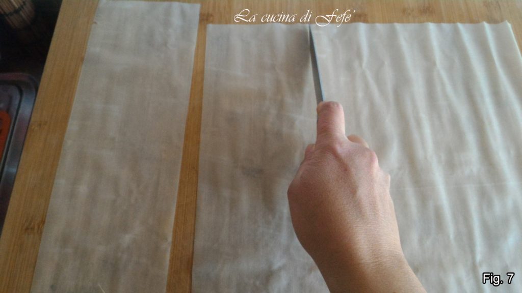 Legen Sie ein Filoteigblatt nach dem anderen aus und schneiden Sie es in vier Rechtecke von etwa 35×11 cm (Abb. 7).