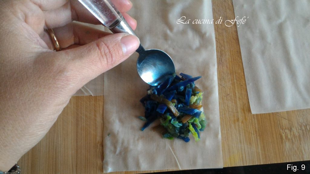 Legen Sie einen großen Löffel des inzwischen kalten Gemüses auf die Basis des Rechtecks 3 cm vom unteren Rand und etwa 1,5 cm von der rechten Seite entfernt (Abb. 9).