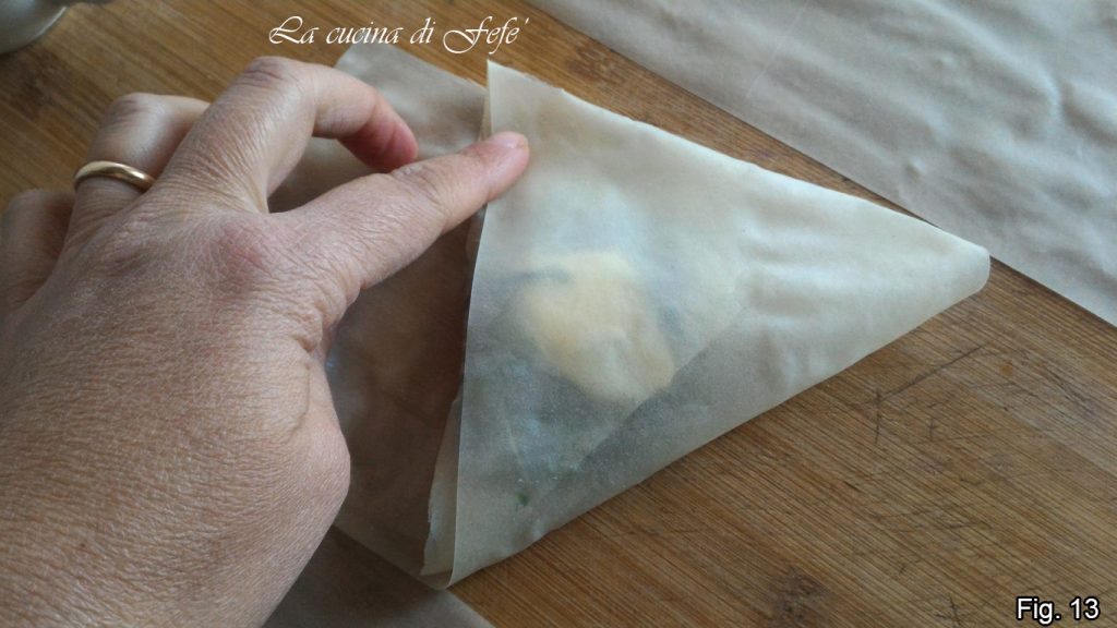 Beginnen Sie dann, den Teig über sich selbst zu falten, um bei jeder Falte ein Dreieck zu erhalten (Abb. 11 und 12).