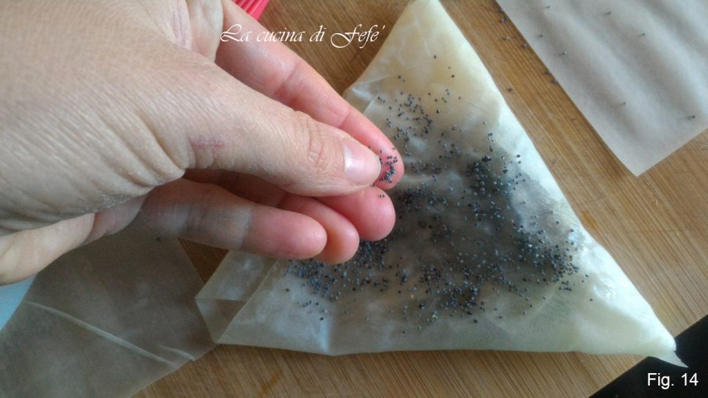Sobald das Dreieck geschlossen ist, bestreichen Sie die Oberfläche mit etwas Öl und bestreuen Sie sie mit Mohnsamen (Abb. 14).