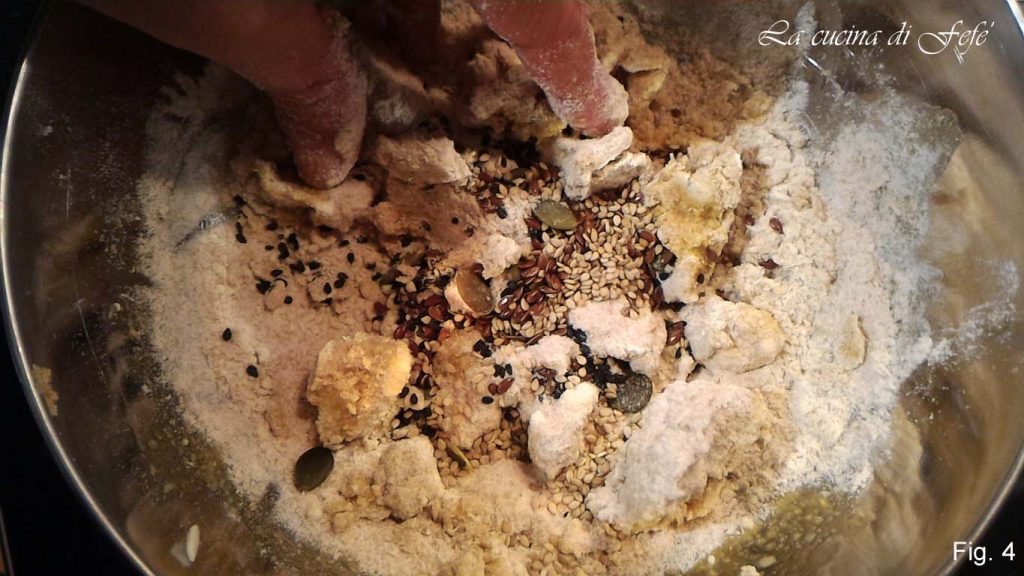 Fügen Sie dann dieser Mischung die Mehl-, Grana- und Salz-Mischung hinzu und geben auch die gemischten Samen dazu und beginnen Sie mit den Händen zu kneten (Abb. 4).