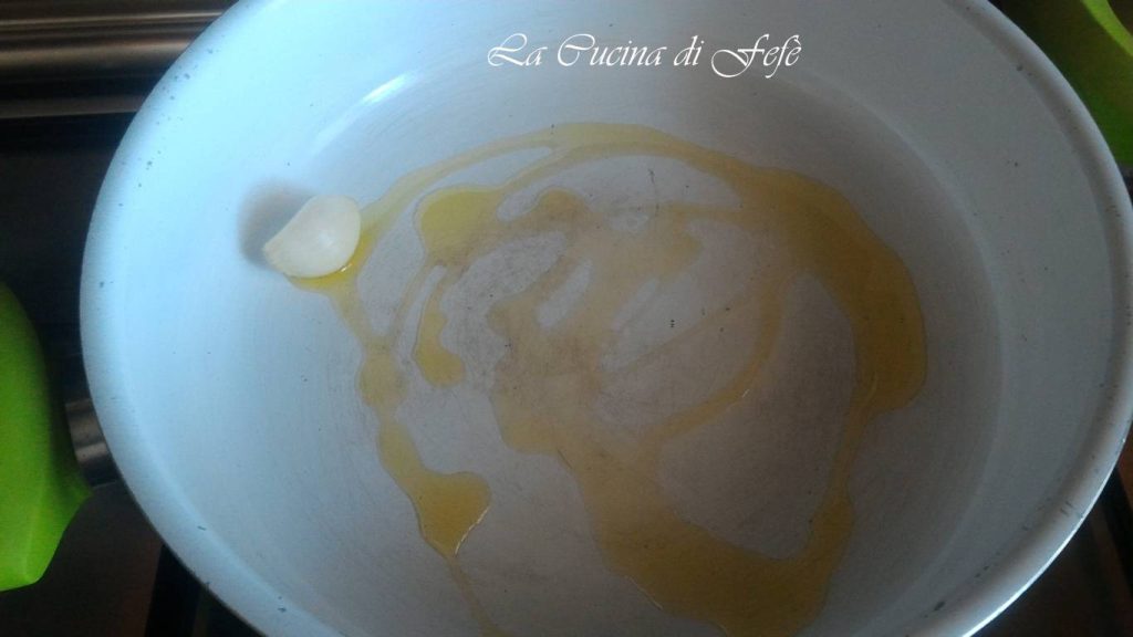 In einem großen Topf bräune eine große Knoblauchzehe mit zwei großzügigen Schüben Olivenöl an.