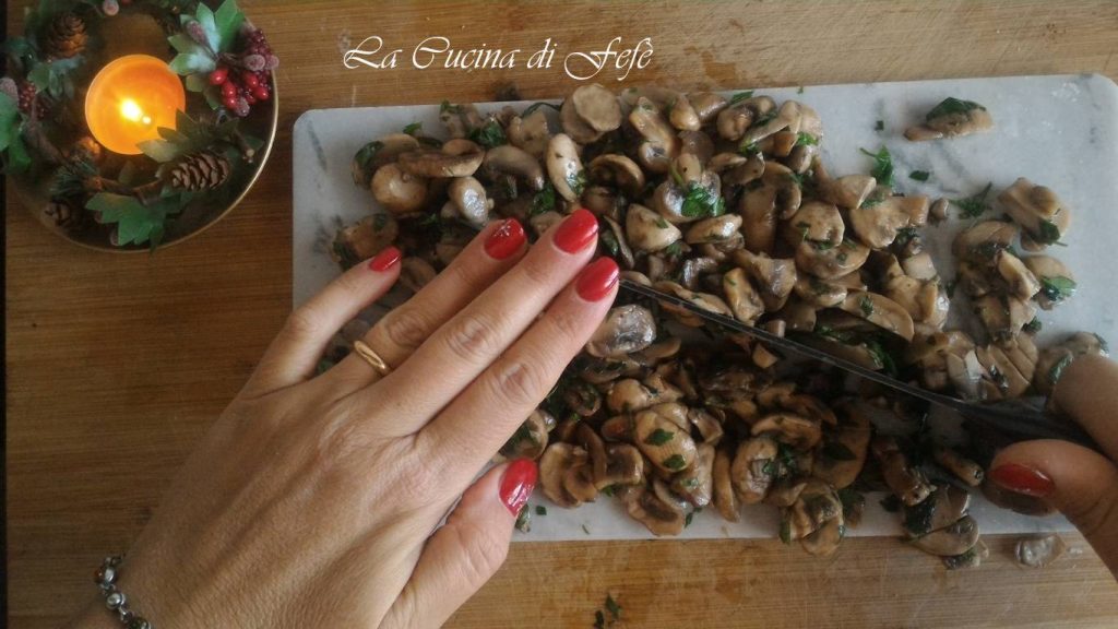Hacke die erkalteten Pilze fein mit einem Messer und stelle sie beiseite.