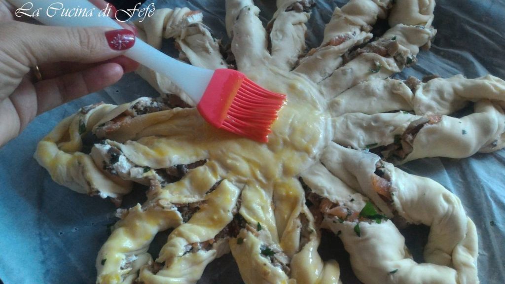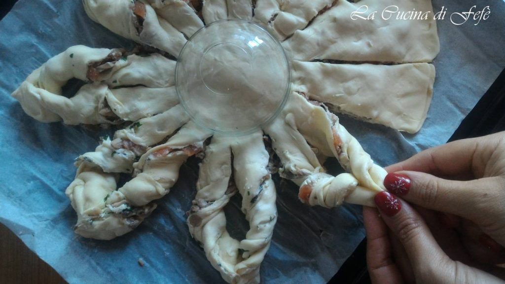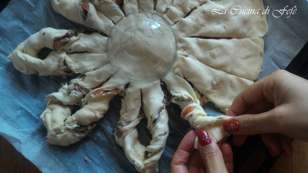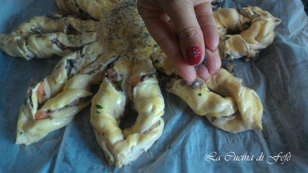 Gerade aufgrund ihrer Vielseitigkeit eignet sich diese Torte in Form einer Schneeflocke für verschiedene Varianten, sogar süße, die jeden Gaumen zufriedenstellen können. Die verschiedenen Fülloptionen können je nach Saison und den Vorlieben oder Ernährungsbedürfnissen deiner Gäste variieren. Ich habe zum Beispiel die klassische und raffinierte Kombination aus gebratenen Champignon-Pilzen und geräuchertem Lachs gewählt. Wenn du Aufschnitt magst, kannst du einfach Ersatz oder Varianten machen, wie ich es am Ende des Rezepts empfehle.