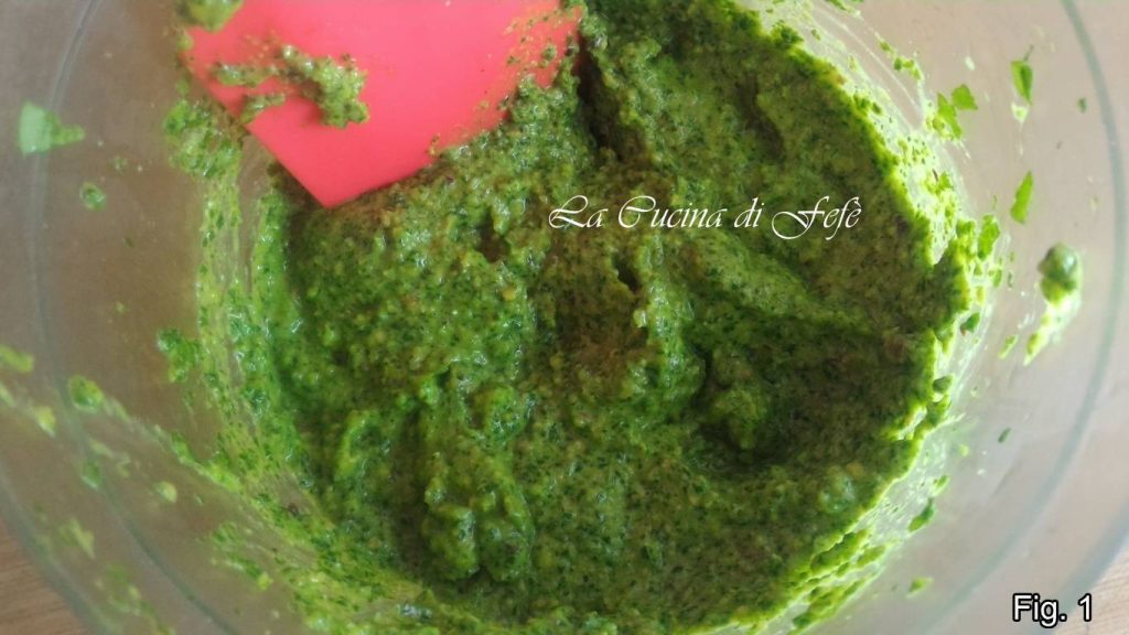 Beginnen Sie damit, das Rucola-Pesto vorzubereiten, auch einen Tag vorher zur Bequemlichkeit, indem Sie alle Schritte des Rezepts HIER befolgen (Abb. 1).