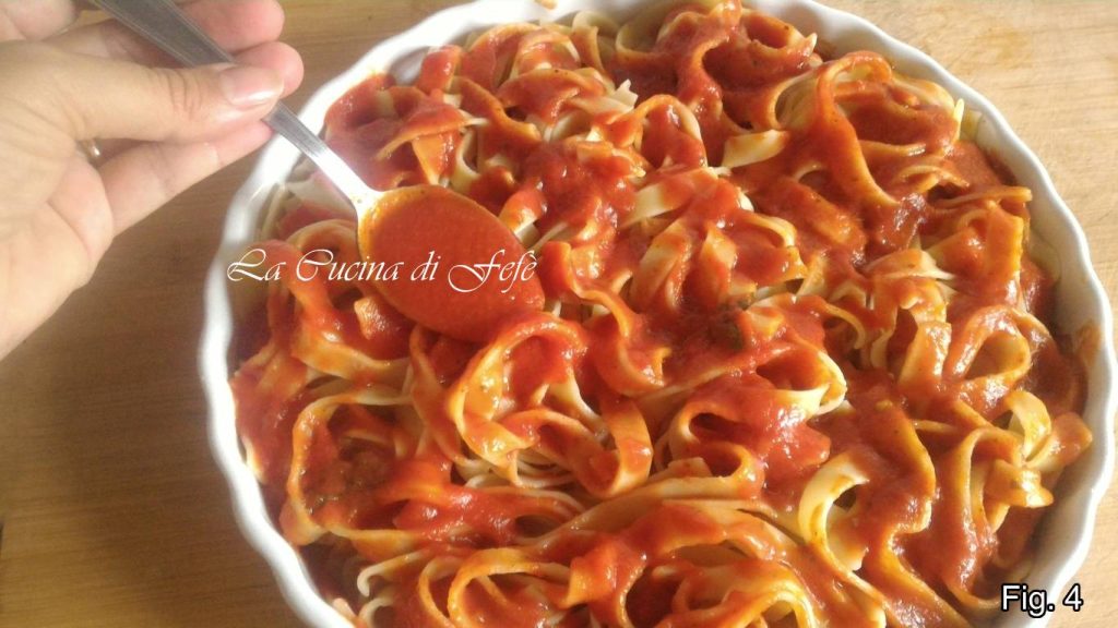 Mit 2 Esslöffeln Öl beträufeln und gut vermischen. Dann in einer Auflaufform 26 Ø etwas Tomatensoße auf dem Boden verteilen und die Bandnudelnester mit Hilfe einer Holzgabel neu formen und nebeneinander legen, bis die gesamte Fläche der Form bedeckt ist (Abb. 3).