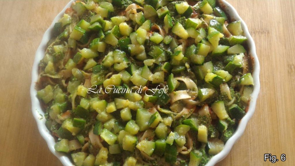 Separat die Zucchini waschen, putzen und in ziemlich kleine Würfel schneiden. In einer antihaftbeschichteten Pfanne eine Knoblauchzehe mit 2 Esslöffeln Öl anbraten, dann die Zucchiniwürfel hinzufügen und bei schwacher Hitze etwa 12′-13′ zugedeckt dünsten lassen, bei Bedarf nur wenig Wasser hinzufügen. Abschmecken, salzen und pfeffern nach Belieben. Abkühlen lassen und die gekochten Würfel über die gesamte Fläche der Form verteilen (Abb. 6).