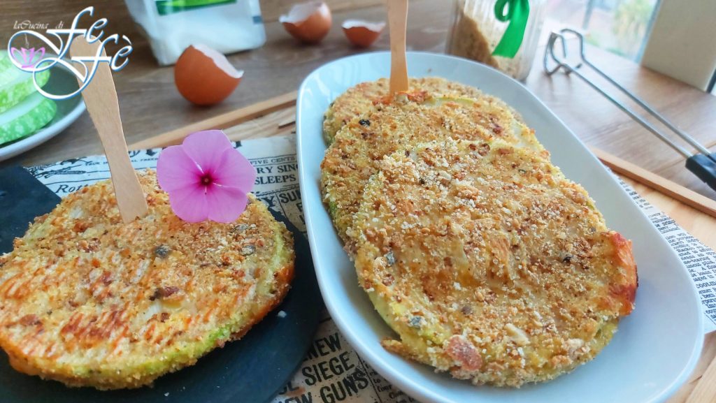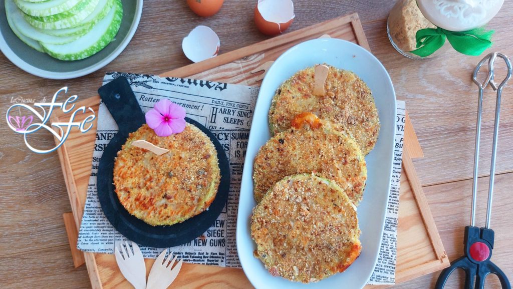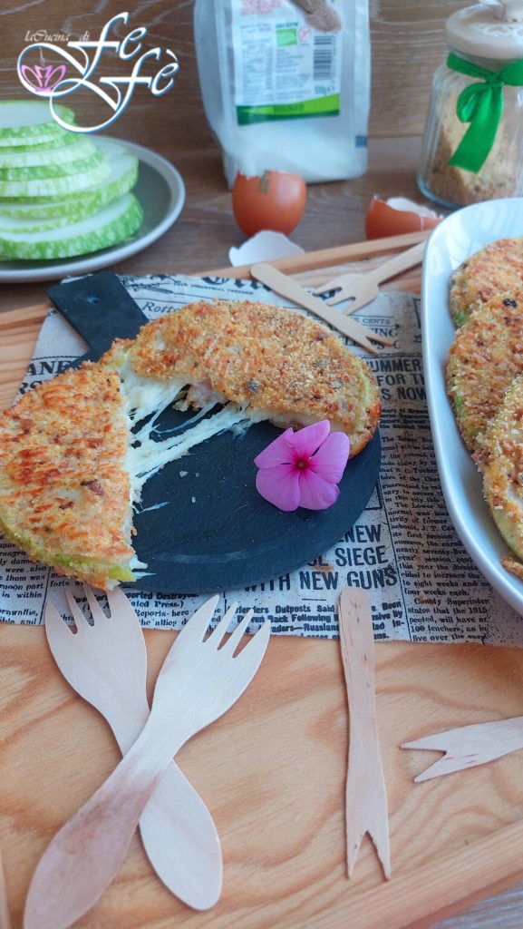Anlässlich der Weinlese, die jedes Jahr auf dem Land bei meinen Onkeln stattfindet, hatte ich das Glück, neben gutem Wein auch zwei schöne und große runde Zucchini zu bekommen. Früher hatte ich sie gefüllt mit Bulgur, griechischem Feta und Paprika zubereitet, aber sie waren viel kleiner! Was damit machen? Die erste Hälfte einer von ihnen habe ich einfach auf dem Grill gegrillt, wie originell, aber dann hatte ich Lust, sie zu panieren, also habe ich die zweite Hälfte in Scheiben von etwa einem halben Zentimeter geschnitten, sie in Mehl, dann in geschlagenen Eiern und schließlich in Semmelbröseln gewälzt und dann gebacken. Wirklich ausgezeichnet, aber als ich sie genoss, kam mir die Idee, sie noch köstlicher zu machen, indem ich sie dünner und doppelt mache, und mit einem schmelzenden Käseherz. Schnell gemacht! So entstand dieses Rezept, indem ich die zweite zur Verfügung stehende Zucchini nutzte! Ich sage euch, sie sind eine Geschmacksbombe! Mit diesen, die wie Koteletts mit einem super schmelzenden und wirklich unwiderstehlichen Herz aussehen, bringt ihr ein vegetarisches Hauptgericht auf den Tisch, das schmackhaft, köstlich und auch ziemlich leicht ist. Sie sind schnell zubereitet und werden sicherlich allen gefallen, auch euren Kindern, die sich immer weigern, Gemüse zu essen!