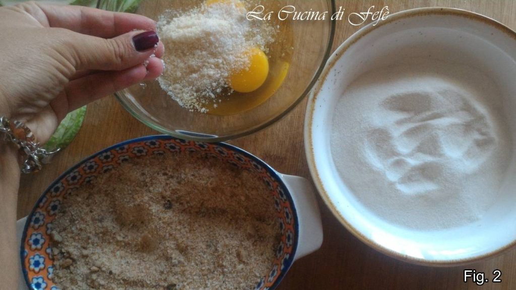 Legt in eine Schüssel das Reismehl mit einer Prise Salz, in eine zweite die Semmelbrösel, aromatisiert mit Kräutern wie Minze, Thymian und Basilikum, und schließlich in eine dritte größere Schüssel bereitet ihr ein Ei-Gemisch mit den geriebenem Parmesan sowie einer Prise Salz und Pfeffer vor.