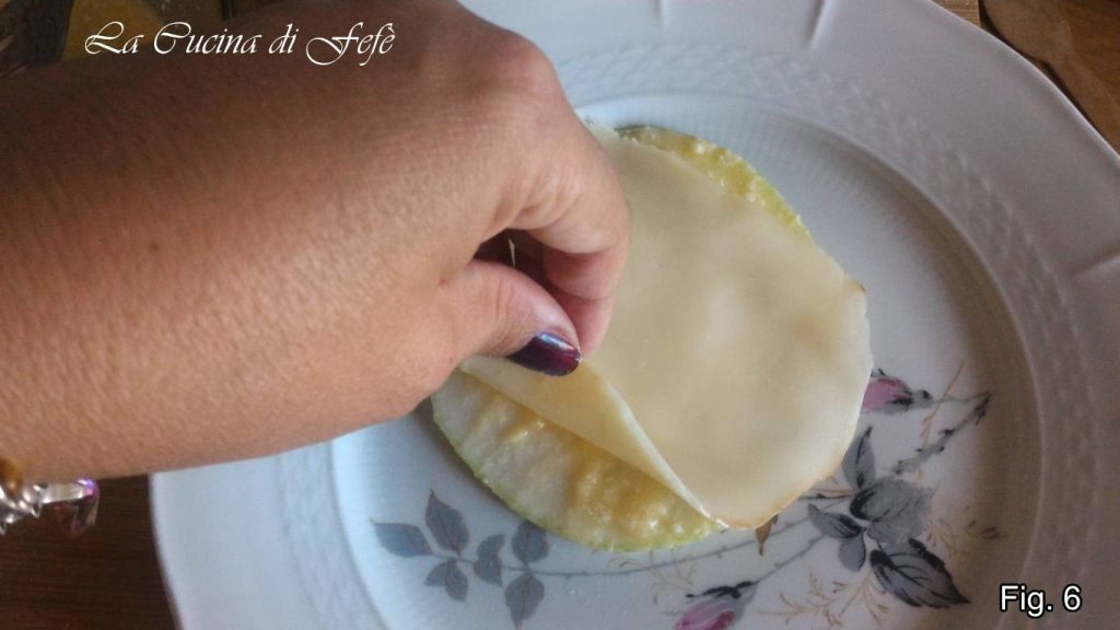 Legt jede im Ei gewendete Scheibe auf einen Teller und belegt sie mit einer Scheibe geräucherter Provola.