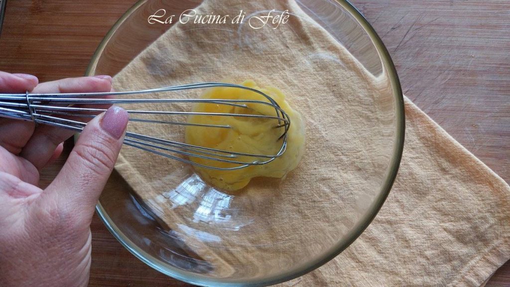 • Füge nun den Mandelmilch* nach und nach hinzu, während du weiter mit dem Schneebesen schlägst.