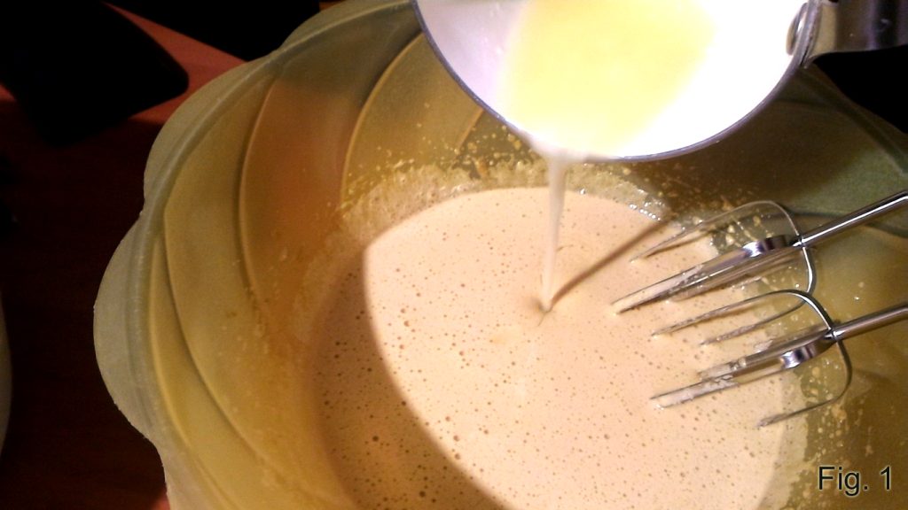 • In einer Schüssel die Eier bei Zimmertemperatur zusammen mit dem Zucker mit den elektrischen Rührbesen für etwa 10 Minuten schlagen. Zur Erleichterung empfehle ich in solchen Fällen, eine Küchenmaschine zu verwenden, wenn Sie eine zur Verfügung haben, da Sie so den Rest der Zutaten verarbeiten und die Zubereitungszeit reduzieren können. Dann das geschmolzene Butter hinzufügen, das zuvor im Wasserbad geschmolzen wurde.