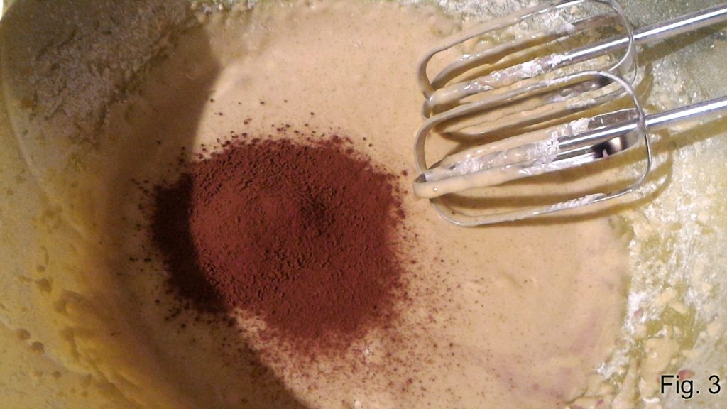 • Das gesiebte Mehl und Backpulver hinzufügen und weiter mit den Rührbesen arbeiten, bis der Teig glatt und homogen ist. Ich habe auch den Kakao hinzugefügt, aber das ist optional.