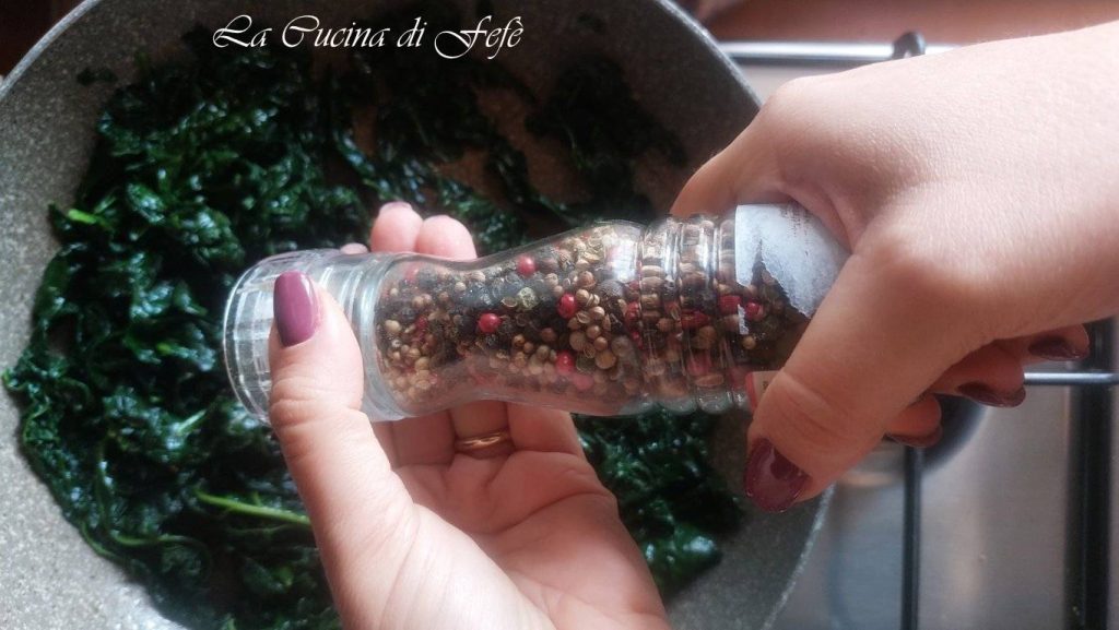 Fügen Sie die Schwarzkohlblätter mit ihrem Eigenwasser hinzu, am Anfang werden sie wie Spinat sehr voluminös erscheinen, drücken Sie sie mit den Händen flach und decken Sie sie mit einem Deckel ab, um sie bei milder Hitze zu dünsten für ca. 8′ .