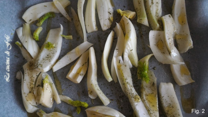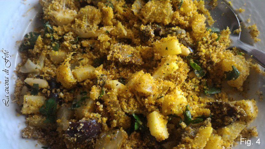 • Im Ofen bei 190°C 30 Minuten backen. Bereite in der Zwischenzeit die Füllung vor: In einer Schüssel die gewürzten Semmelbrösel, die entsteinten und in Scheiben geschnittenen Oliven, die unter fließendem Wasser entgesalzenen und gut ausgedrückten Kapern, die in Würfel geschnittene Provola, den Schnittlauch, die Kurkuma und den aus dem Ofen genommenen Fenchel in Stücke geschnitten zusammengeben.