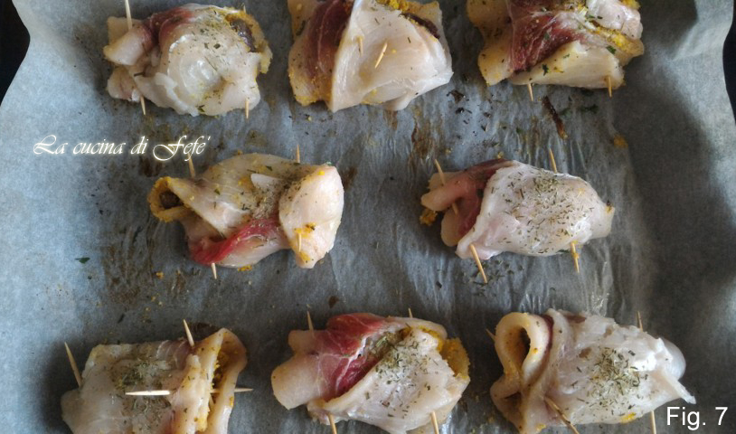 • Die Röllchen zusammenrollen und mit 2 Zahnstocher fixieren, damit die Füllung beim Garen nicht herausläuft.