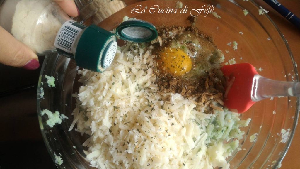 Mit einem Spatel oder Löffel mischen und schließlich das Mehl und die Semmelbrösel hinzufügen. Nochmals mischen, mit Frischhaltefolie abdecken und im Kühlschrank für 1 Stunde ruhen lassen. Auf diese Weise nehmen die Semmelbrösel die überschüssige Feuchtigkeit auf.