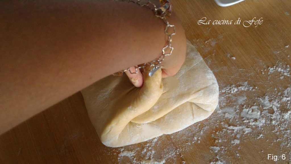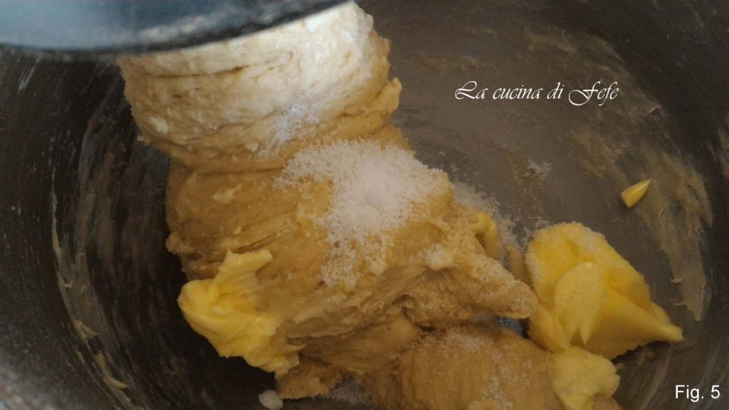 Wenn die Masse fest wird, Salz und weiche Butter, fast cremig, nach und nach hinzufügen. Wenn die letzte Portion absorbiert wurde, fügt die letzten 50 g Mehl hinzu und arbeitet den Teig mindestens 15′ bis zur Bindung.