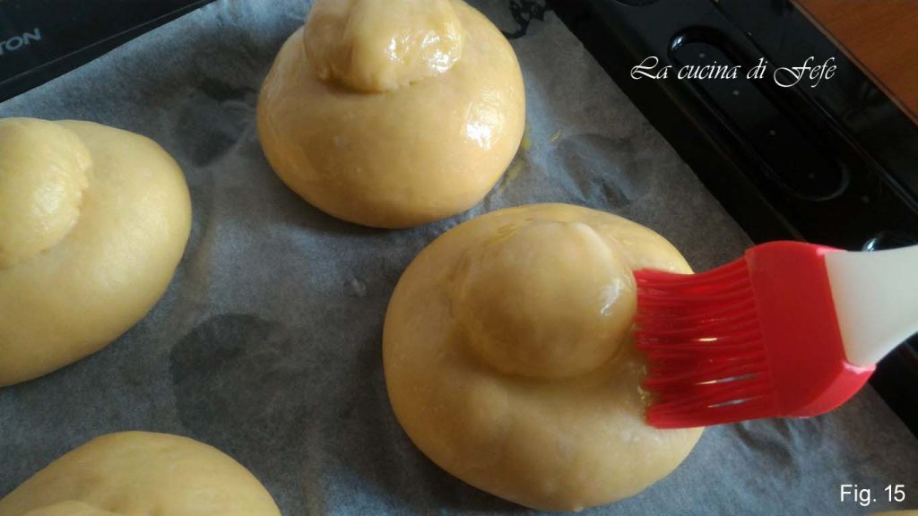 Am nächsten Morgen die Brioches aus dem Kühlschrank nehmen und für 2 h akklimatisieren lassen. Dann die Oberfläche mit einem Eigelb und 1 Esslöffel Milch bestreichen.