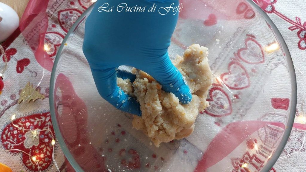 Wenn die Mischung mit dem Holzlöffel schwer zu bearbeiten wird, beginne, sie mit den Händen zu kneten, bis du einen homogenen, weichen, aber festen Teig erhältst.