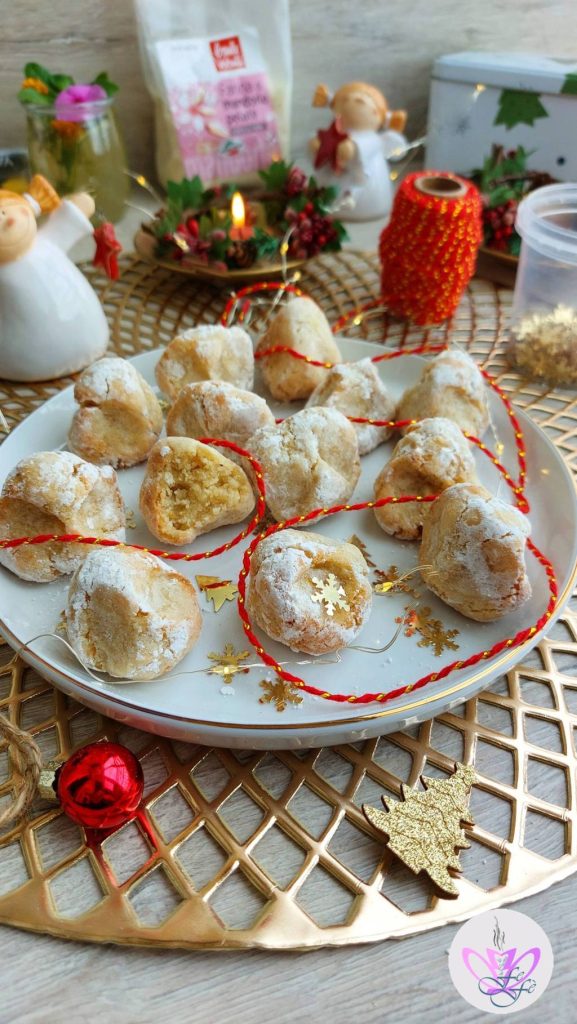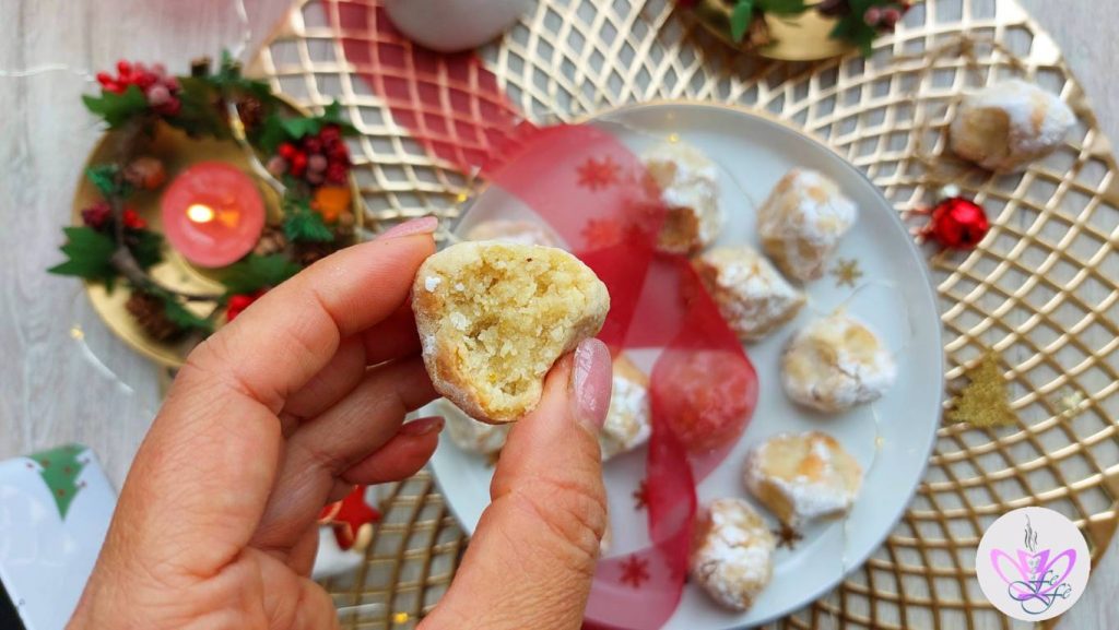 Lege die Kugeln nacheinander auf ein Backblech, das mit Backpapier oder, so wie ich, mit einer wiederverwendbaren Silikonmatte ausgelegt ist, und zwicke sie mit Daumen und Zeigefinger beider Hände leicht. Stelle das Backblech in den Kühlschrank und lasse die Kekse mindestens 3 Stunden ruhen, besser wäre jedoch über Nacht***. Nach der Ruhezeit backe sie in einem vorgeheizten, belüfteten Ofen bei 170°C für 12′ nicht länger. Sie sollen nur leicht bräunen, sonst werden sie zu hart.