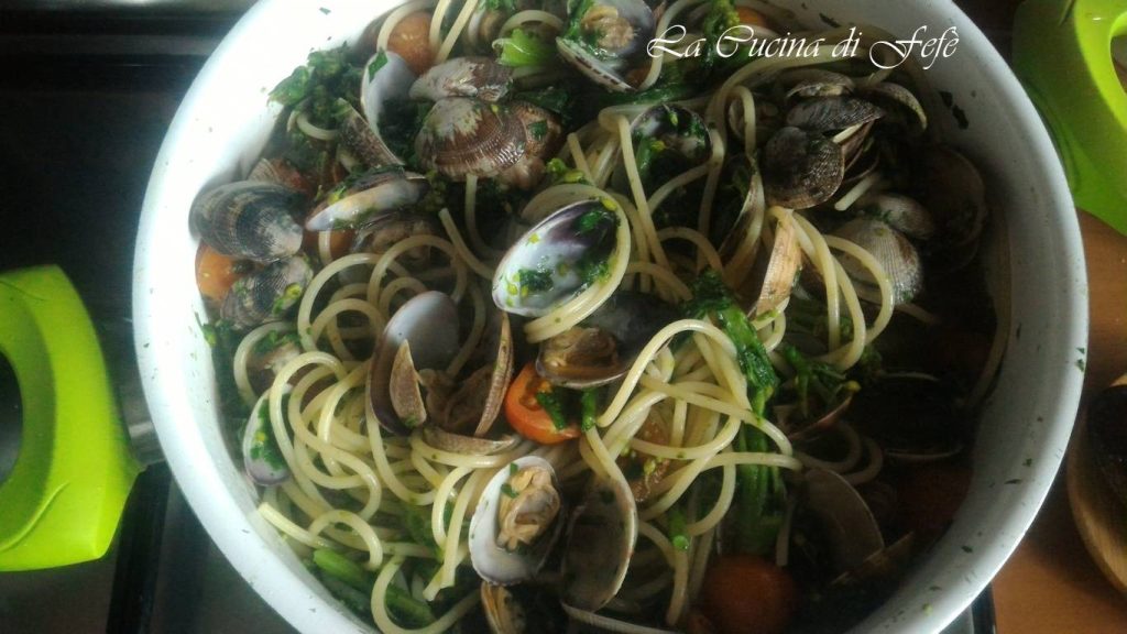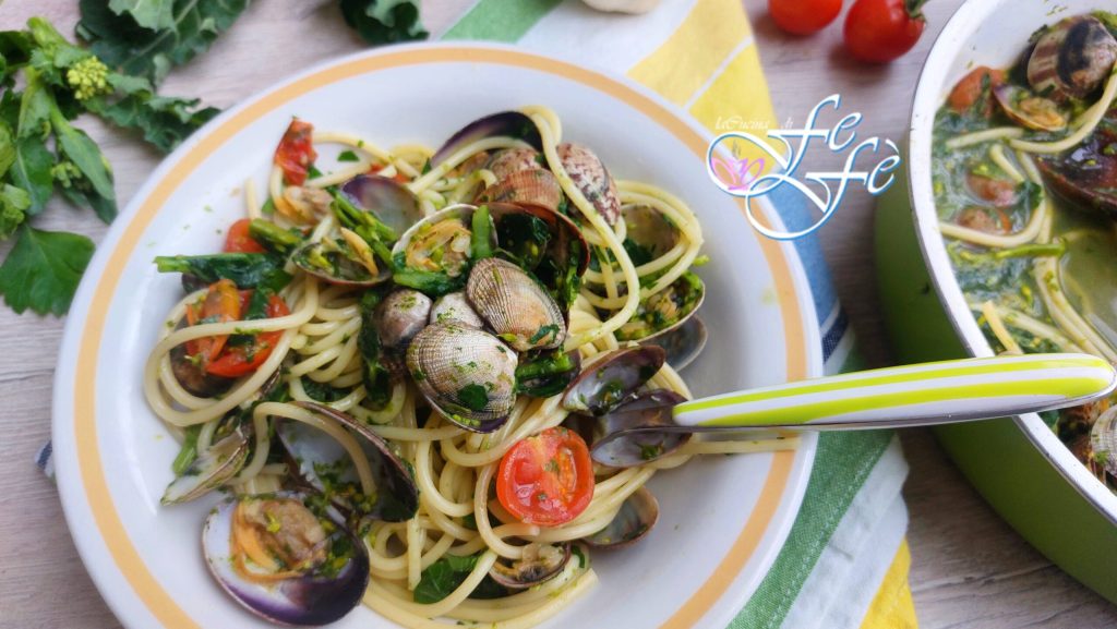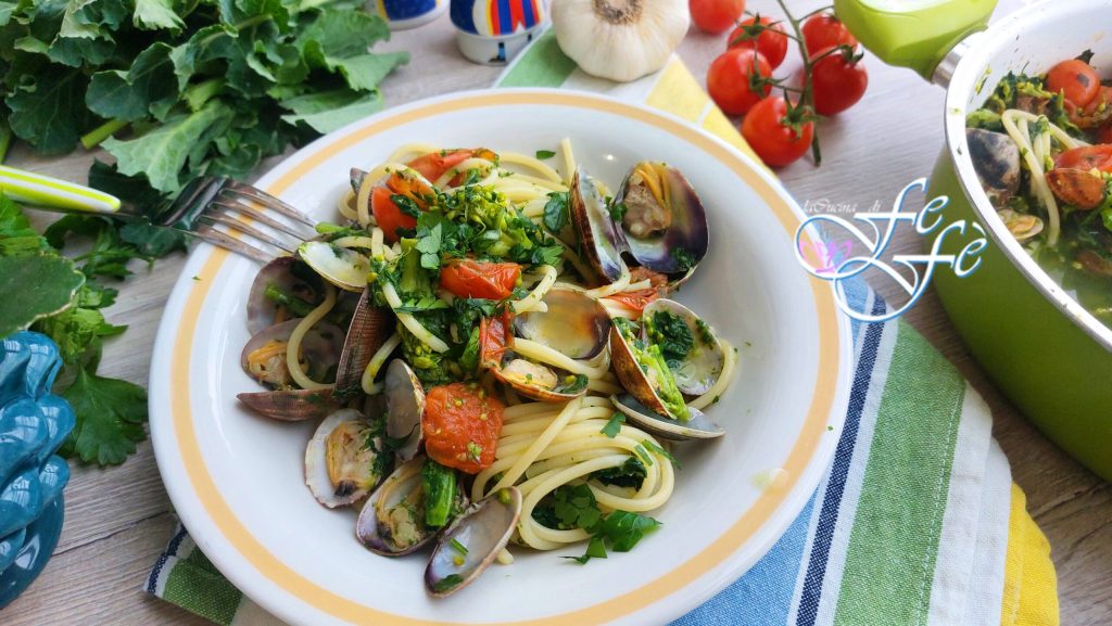 Wenn ihr mir auf den sozialen Medien gefolgt seid, wisst ihr, dass ich vor einigen Tagen von meiner Nachbarin schöne Bündel von wildem Brokkoli aus ihrem Garten erhalten habe! Ein sehr geschätztes Geschenk für mich, der immer auf der Suche nach der Echtheit der Produkte ist, die ich kaufe, und wenn sie aus der Region sind, umso besser! Und nach einer sorgfältigen Analyse der Möglichkeiten, wie ich sie verwenden könnte, und angesichts der nicht gerade geringen Menge, die ich erhalten habe, habe ich beschlossen, einen Teil davon zu nutzen, um einen schönen Hauptgang im Stile von Meer und Berge zu schaffen! Ein Gericht, das sicherlich den Sommer evoziert, aber gleichzeitig noch einen winterlichen Eindruck hinterlässt! Was soll ich sagen? Die Kombination mit den frischen Muscheln ist wirklich etwas Einzigartiges, besonders wenn man nicht zu den Puristen gehört und, wie ich, gerne neue Kombinationen ausprobiert! Ja, denn auch wenn es stimmt, dass Spaghetti mit Muscheln traditionell in Weiß oder allenfalls mit einigen Tomaten zubereitet werden, um etwas Farbe hinzuzufügen, verdient diese Variante jedoch, ausprobiert zu werden! Der starke und entschiedene Geschmack der Brokkoli übertönt nämlich nicht den zarteren der Muscheln. Stattdessen verschmelzen ihre Düfte und Aromen miteinander und schaffen eine sehr schmackhafte und ansprechende Soße, ideal zum Würzen von Spaghetti oder jeder anderen langen Pasta, die ihr wünscht! Ein einfaches Rezept, das zudem sehr schnell zuzubereiten ist und sich ideal für große Anlässe wie Weihnachten oder große Familienessen am Sonntag eignet!