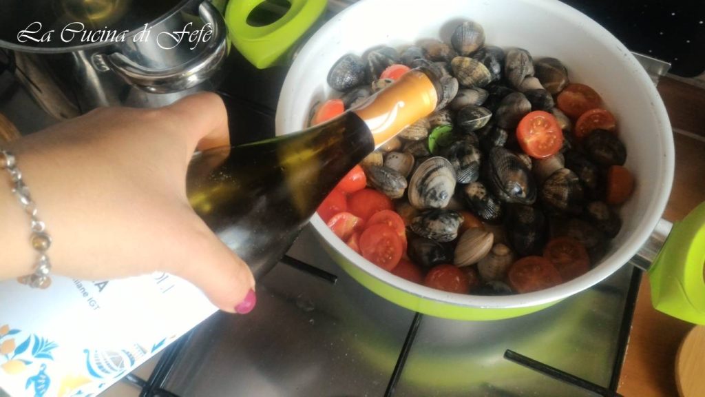 Weitere zwei Minuten anbraten, dann die Muscheln hinzufügen. Mit dem Deckel abdecken und bei starker Hitze 5 Minuten lang öffnen lassen, den Topf gelegentlich schütteln. Wenn sie alle geöffnet sind, mit Weißwein ablöschen und die Hitze hoch halten, damit der Alkoholgehalt verdampft.