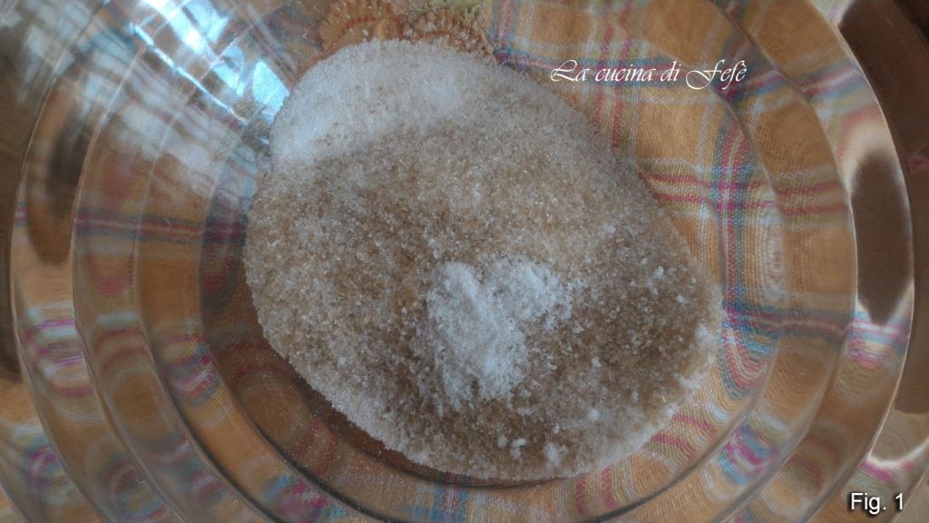Beginnen Sie damit, den Ölteig für die Kekse vorzubereiten. In einer Schüssel habe ich die Hälfte des Erythritols und die Hälfte des Rohrzuckers mit einer Prise Salz hinzugefügt, aber Sie können auch nur einen Süßstoff Ihrer Wahl verwenden (Abb. 1).