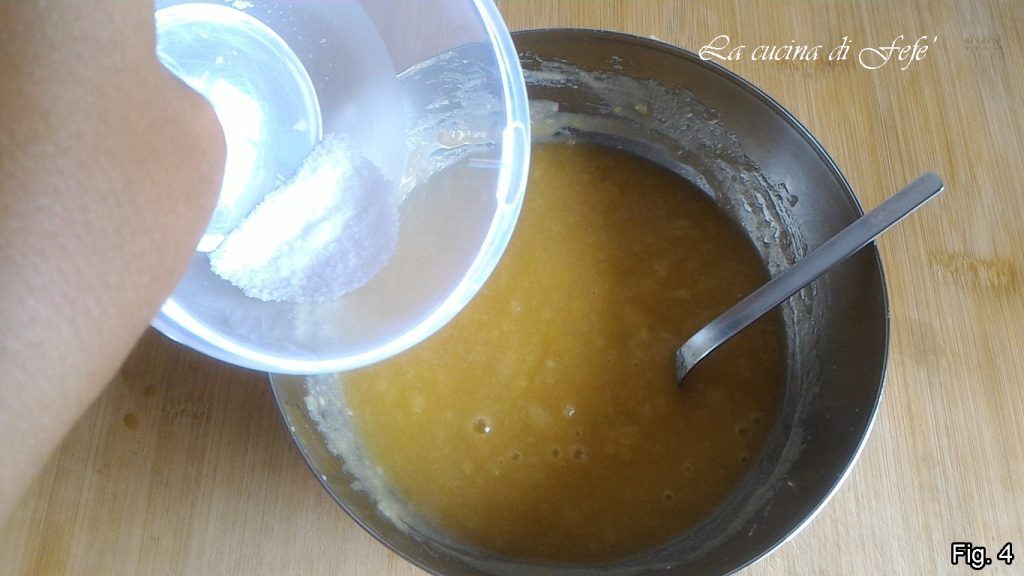 Nach und nach auch das gesiebte Mehl hinzufügen und beginnen, mit einem Holzlöffel zu helfen (Abb. 5).