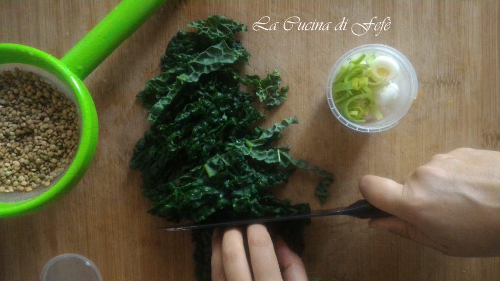 Beginnen Sie am Abend vorher damit, die Cannellini-Bohnen einzuweichen. Am nächsten Tag spülen Sie sie gut unter fließendem Wasser ab und verfahren Sie genauso mit den Linsen. Bereiten Sie auch das Gemüse vor: Schneiden Sie den Lauch der Länge nach ein, entfernen Sie das Ende und schneiden Sie ihn in Ringe, auch den grünen Teil; schneiden Sie den Schwarzkohl in Streifen, wobei Sie die Rippen entfernen können, die Sie für die Gemüsebrühe verwenden können.