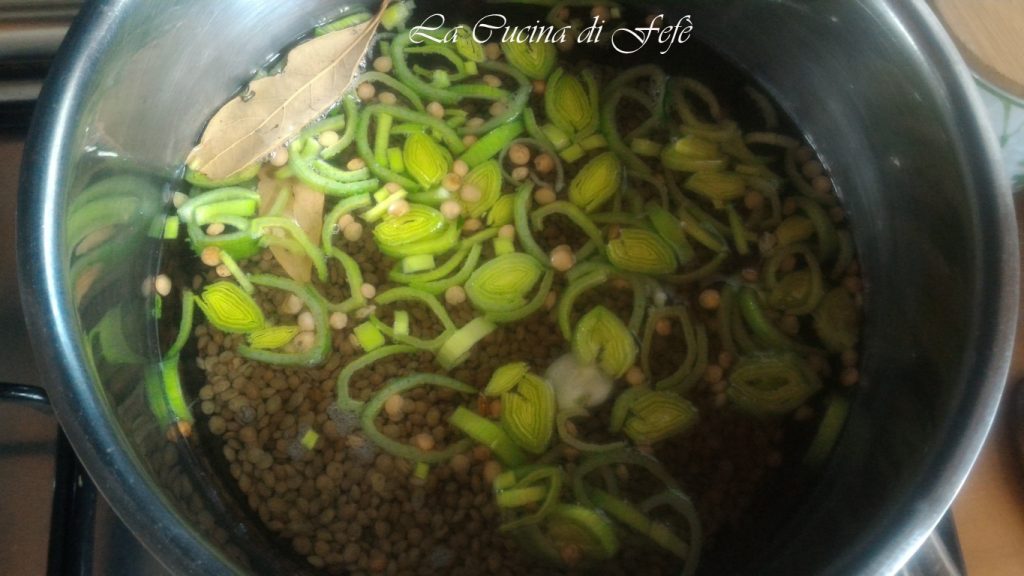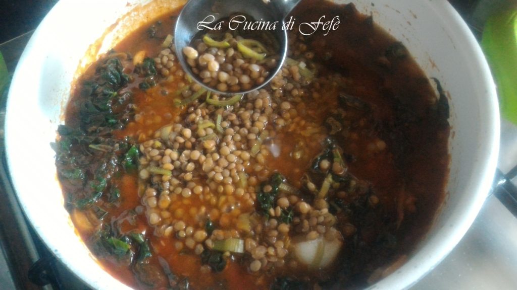 Nachdem Sie einige Minuten gewürzt haben, fügen Sie die inzwischen gekochten Linsen hinzu, wobei Sie darauf achten, einige Schöpfkellen beiseite zu lassen, zusammen mit etwas Kochbrühe, die Sie nach Bedarf hinzufügen, falls die Sauce zu sehr austrocknet.