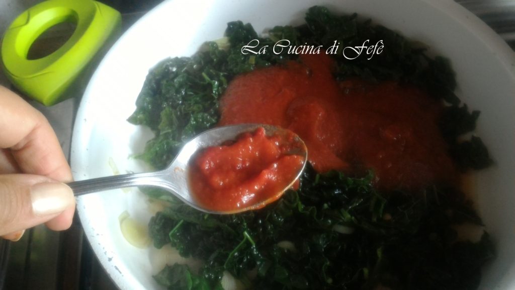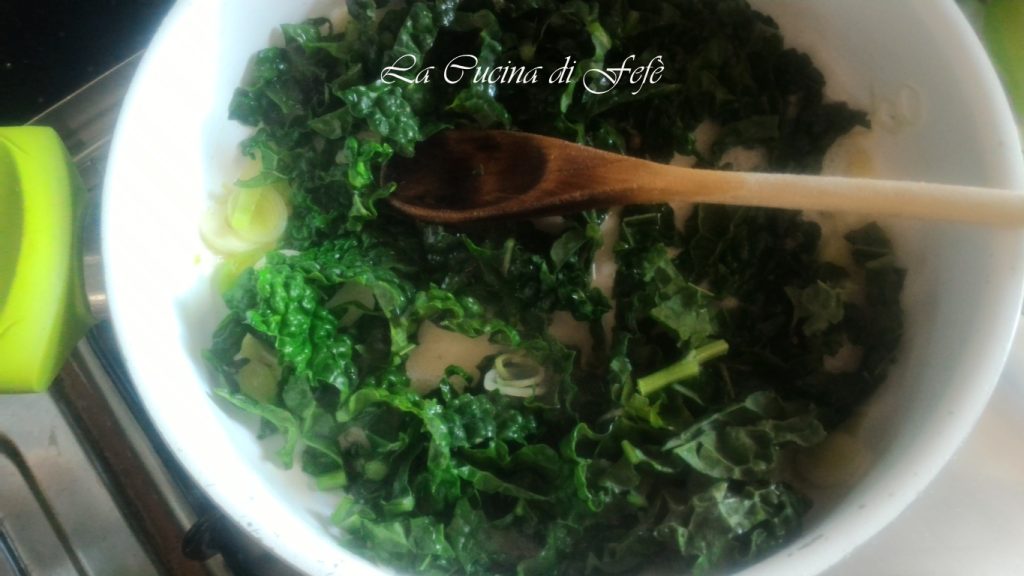 Fügen Sie die restliche Hälfte des Schwarzkohls hinzu und lassen Sie ihn bei schwacher Hitze schmoren, indem Sie einige Minuten mit einem Deckel schließen, und bei Bedarf einige Schöpfkellen heiße Brühe hinzufügen.