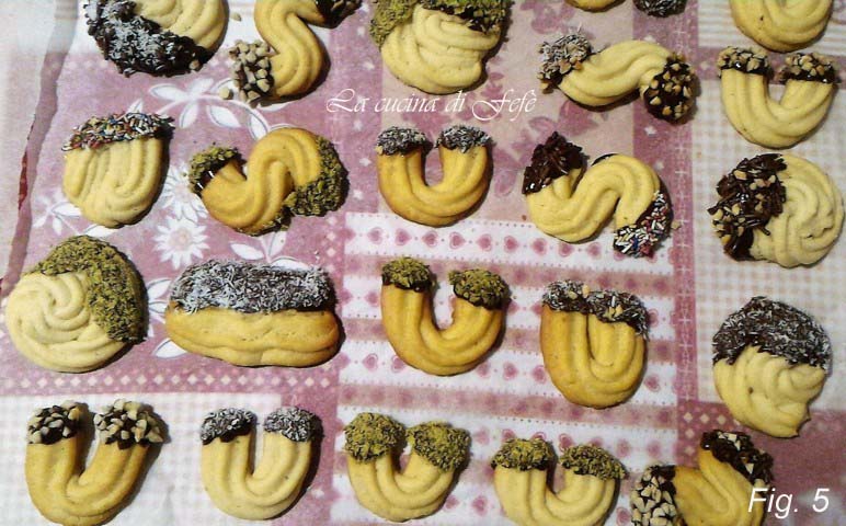 • Entferne dann die Masse aus der Planetenmaschine und füge das gesiebte Vanillin, eine Prise Salz und das gesiebte Mehl zusammen mit dem Backpulver hinzu. Mische alles gründlich von unten nach oben mit einem Spatel oder einem Holzlöffel. Gib die Masse in eine Spritztüte mit einer speziellen Sterntülle und forme die gewünschten Formen (Pferdehufeisen, „S“-Formen usw.). Die Kekse können dann mit kandierten Kirschen oder Mandeln dekoriert werden, bevor sie in den Ofen gehen. Sobald die Kekse geformt sind, lasse sie 1 Stunde im Kühlschrank ruhen und backe sie dann im vorgeheizten statischen Ofen bei 190°C für 5′, dann senke die Temperatur auf 180°C für weitere 8′-10′. Die Kekse sollten nicht dunkel werden, sondern nur goldbraun. Nehmt die Kekse aus dem Ofen und lasst sie auf einem Gitter abkühlen.