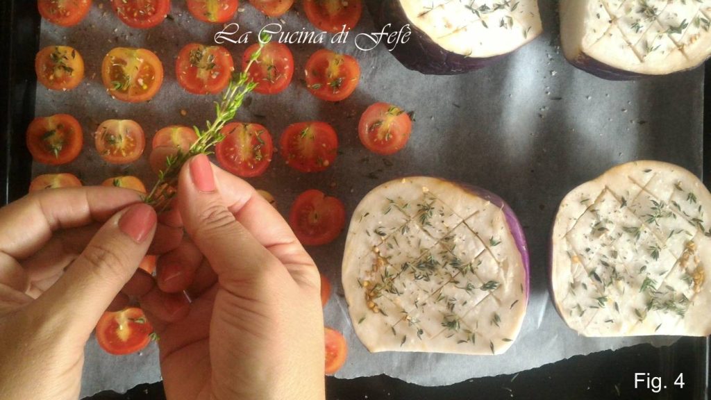 Mit einem großzügigen Schwung Olivenöl extra virgin beträufeln, die ungeschälten Knoblauchzehen* hinzufügen und bei 190 °C für ca. 20-25 Minuten in den Ofen geben, dann mit einem Löffel die wahrscheinlich bereits gekochten Kirschtomaten herausnehmen, die Auberginen zurück in den Ofen geben und für weitere 15 Minuten weitergaren. Das Fruchtfleisch der Auberginen sollte weich sein und die Zinken einer Gabel leicht eindringen können**.