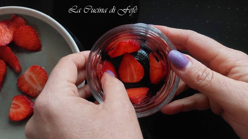 • Unter die zwei Gläser aufteilen und mit weiteren Erdbeerscheiben an den Rändern beenden, diesmal mit der Spitze nach unten, in Abwechslung zu denen, die sich an der Basis befinden.