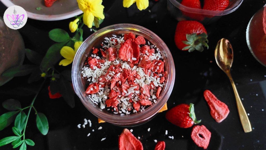 • Mit einer Handvoll grob zerkleinerter gefriergetrockneter Erdbeeren und Kokosraspeln abschließen, den Deckel schließen und über Nacht im Kühlschrank lassen*.